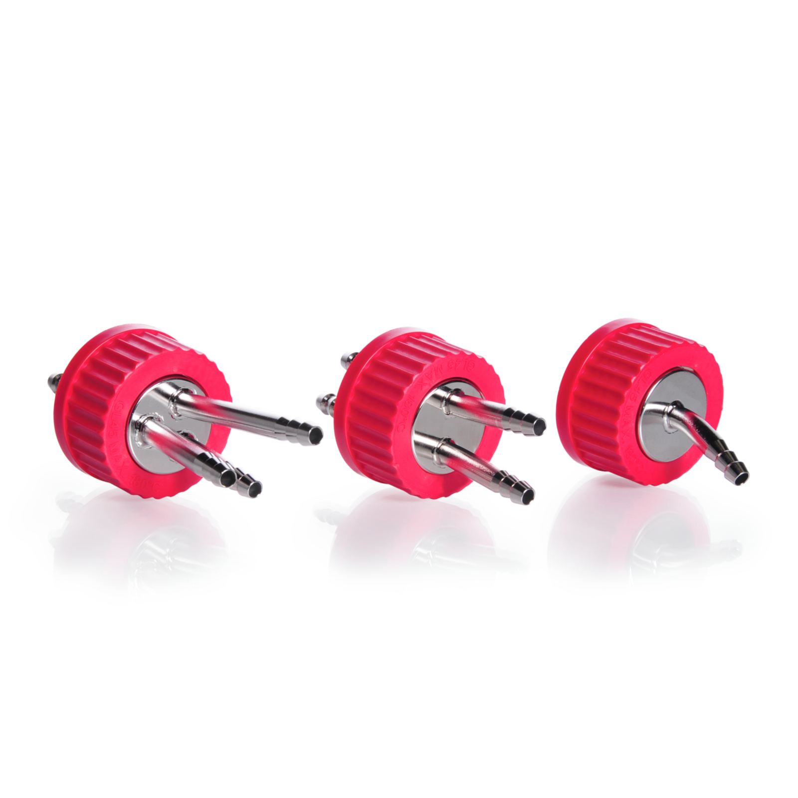Zakrętki wykonane z PBT z 1, 2 lub 3 portami ze stali nierdzewnej. Do łączenia węży laboratoryjnych z butelkami GL 45. Dopuszczone do kontaktu z żywnością. Odporne termicznie i chemicznie. Autoklawowalne w 121 lub 134 °C. Oferowane pojedynczo.