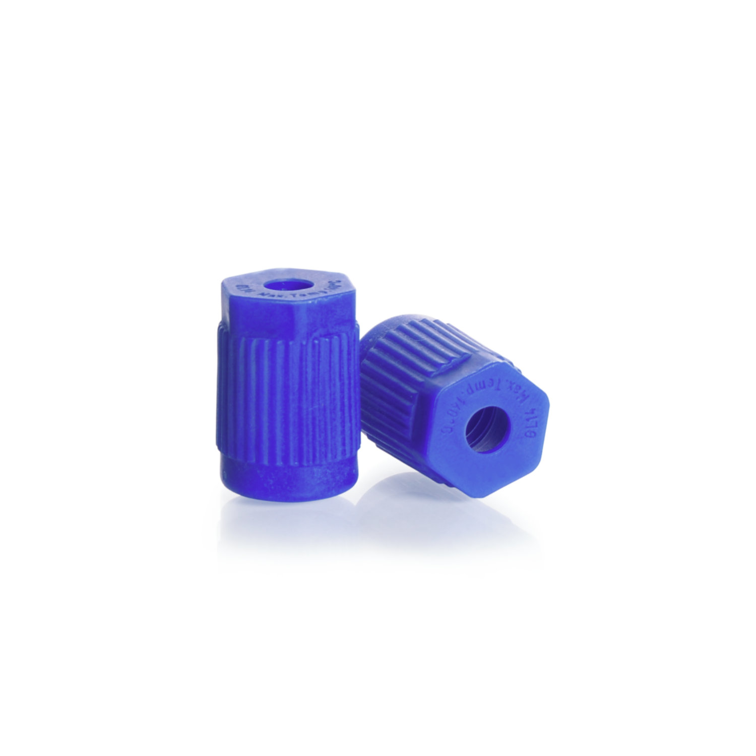 Zakrętki z niebieskiego polipropylenu z otworem do przyłączenia węży. Gwint GL 14. Dedykowane do zakrętki Duran z PP z 2 lub 3 portami GL 14 (G-0260, G-0261) oraz wkładek z silikonu/PTFE (G-0265-G-0268). Opakowanie zawiera 2 szt.
