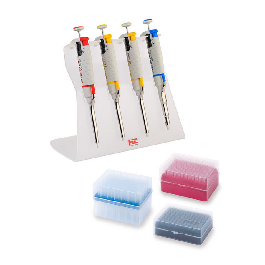 W zestawie znajdują się cztery pipety Discovery Comfort o najczęściej używanych pojemnościach. Zestaw zawiera ponadto dodatkowe akcesoria, takie jak pudełka z końcówkami, klucz kalibracyjny, wieszak na jedną pipetę, kolorowe pierścienie do kodowania barwnego pipet oraz uniwersalny, liniowy statyw 4-miejscowy.