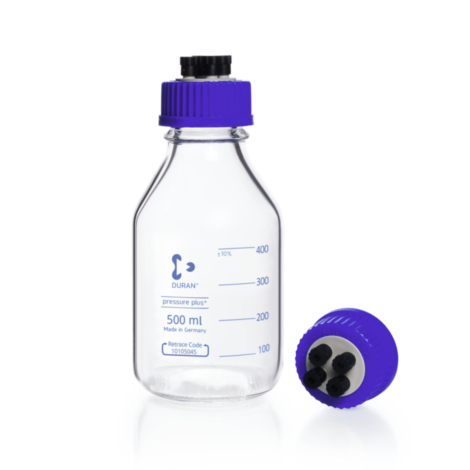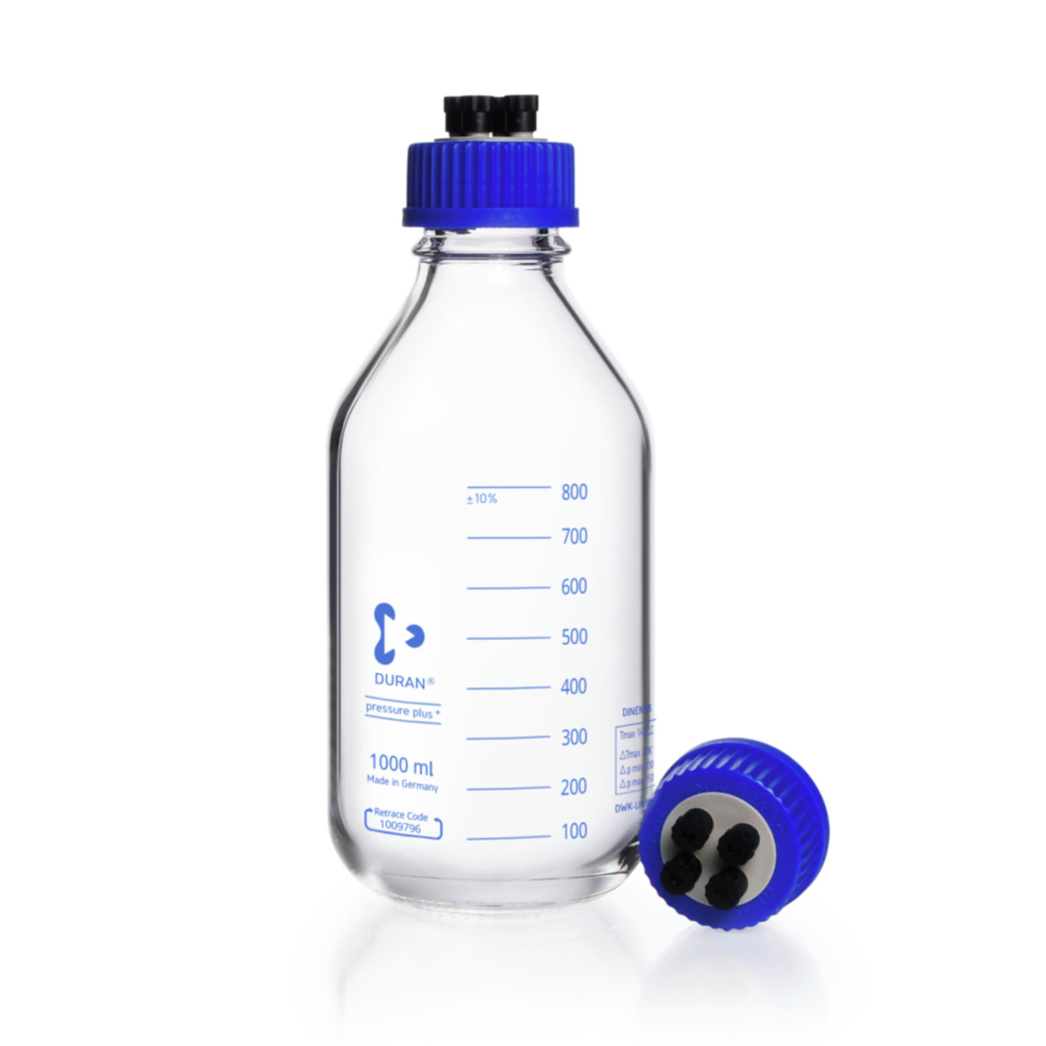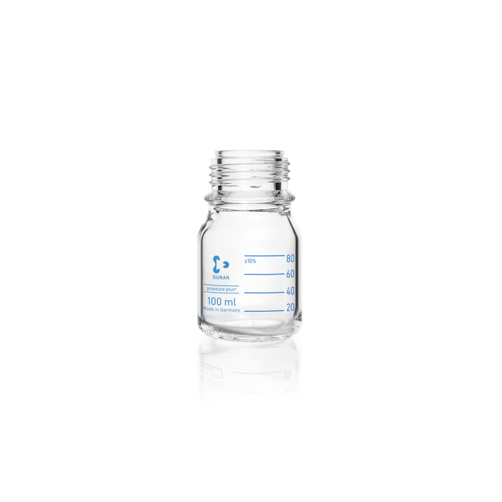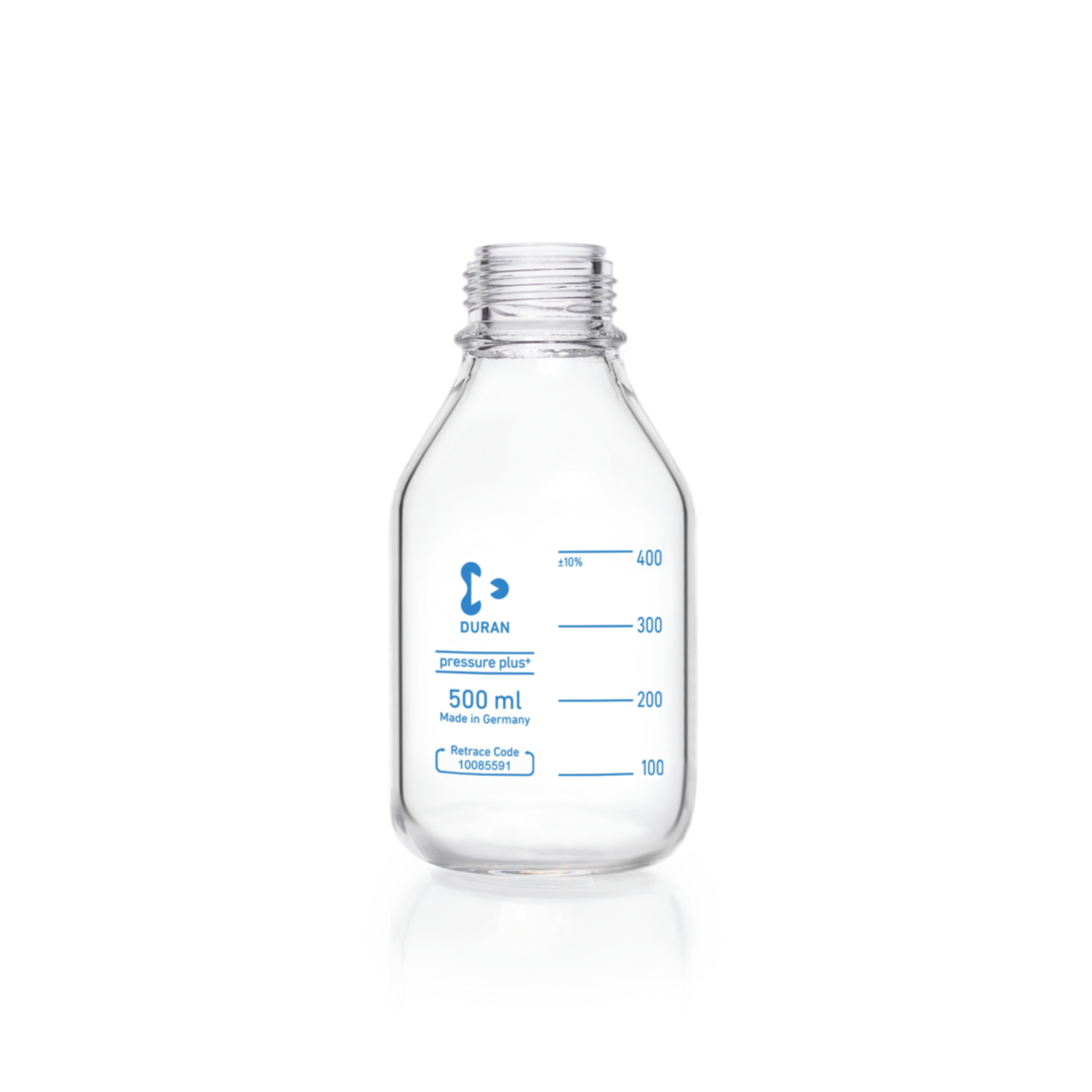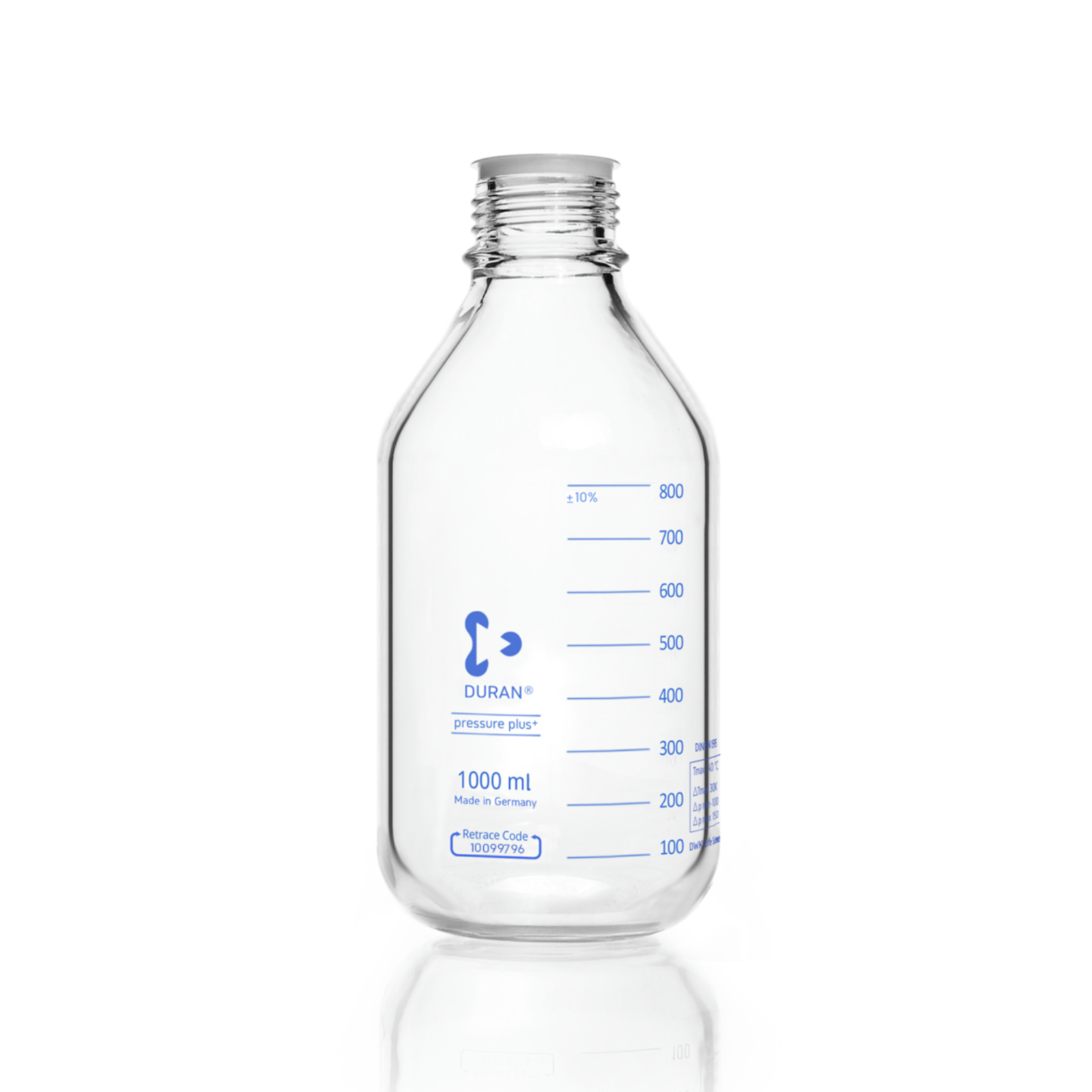 Butelki laboratoryjne Duran Pressure plus+ protect+ są wykonane z wysokiej jakości szkła borokrzemowego Duran®. Z gwintem GL 45 oraz łatwą do odczytania niebieską skalą i polem do opisu. Dzięki specjalnej geometrii są odporne na działanie podwyższonego lub obniżonego ciśnienia. Dodatkowo, są pokryte ochronną powłoką z tworzywa sztucznego (PA 12). Spełniają normę ISO 4796-1 oraz DIN EN 1595.