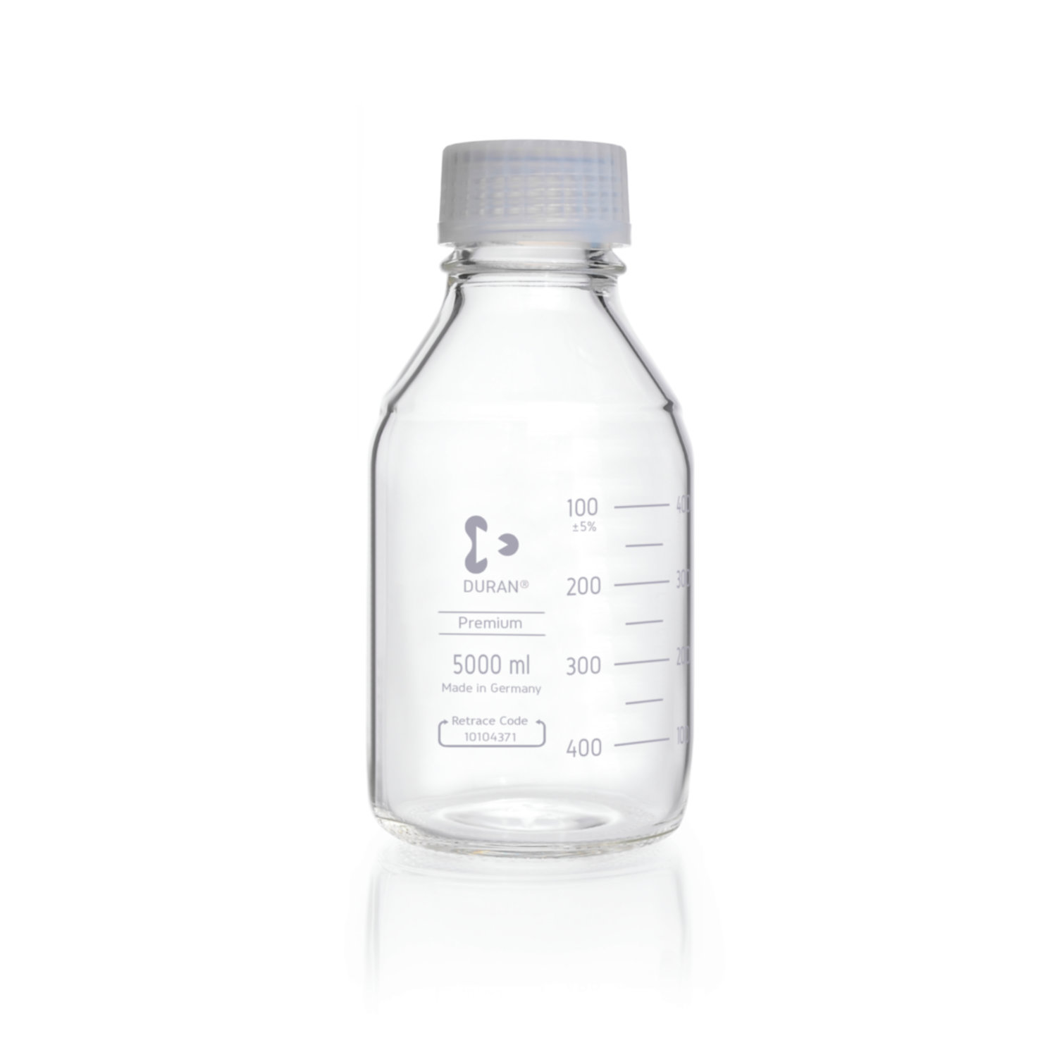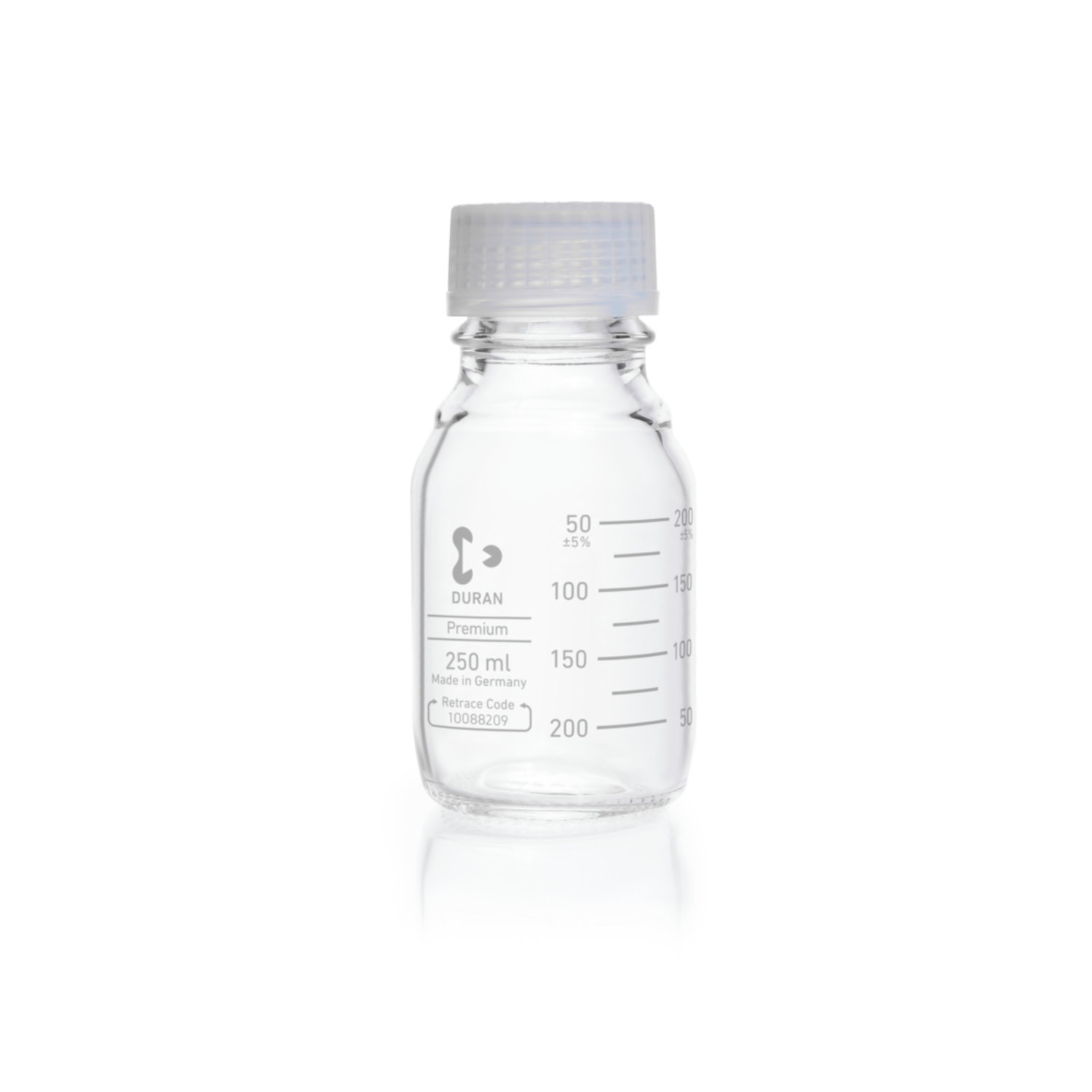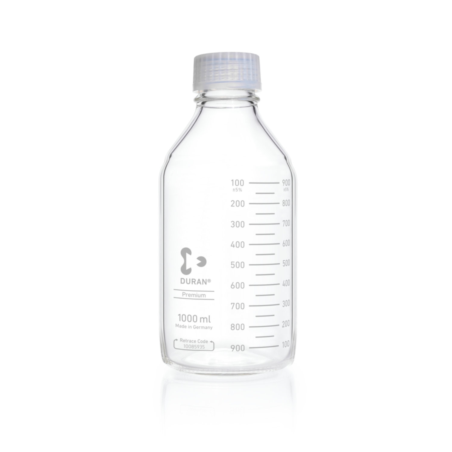 Butelki laboratoryjne Duran® Premium z odpornością na szok termiczny wynoszącą aż 160°C. Z białą, przeciwstawną skalą o dużej dokładności (±5%). Dostarczane z pierścieniami wylewowymi i zakrętkami Duran Premium. Butelki laboratoryjne Duran Premium dostępne są w 4 pojemnościach: 100, 250, 500 oraz 1000 ml.