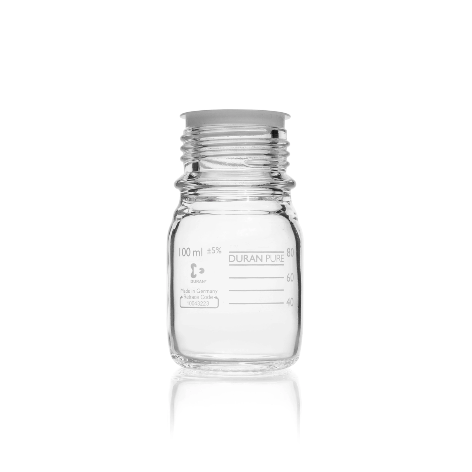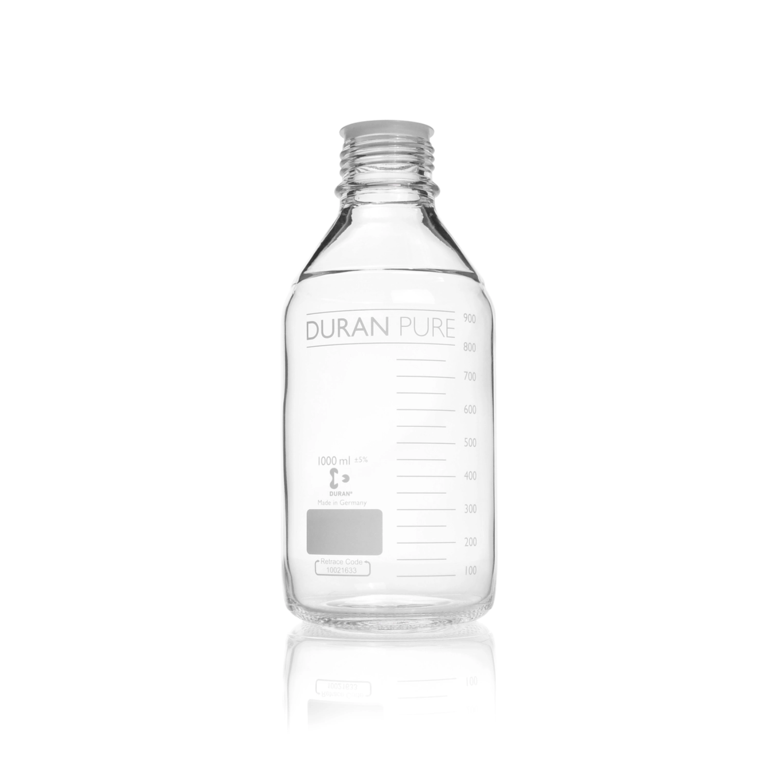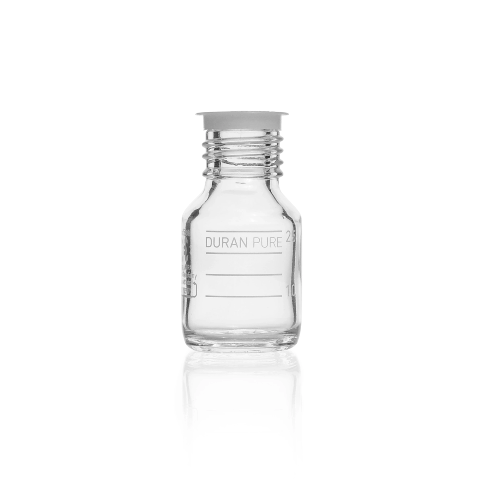 Butelki laboratoryjne Duran® Pure z bezbarwnego szkła borokrzemianowego. Ze standardowym gwintem, bez zakrętek i pierścieni wylewowych, zamykane pokrywkami ochronnymi. Opracowane na potrzeby przemysłu farmaceutycznego. Z certyfikatem analizy (CoA). Autoklawowalne.