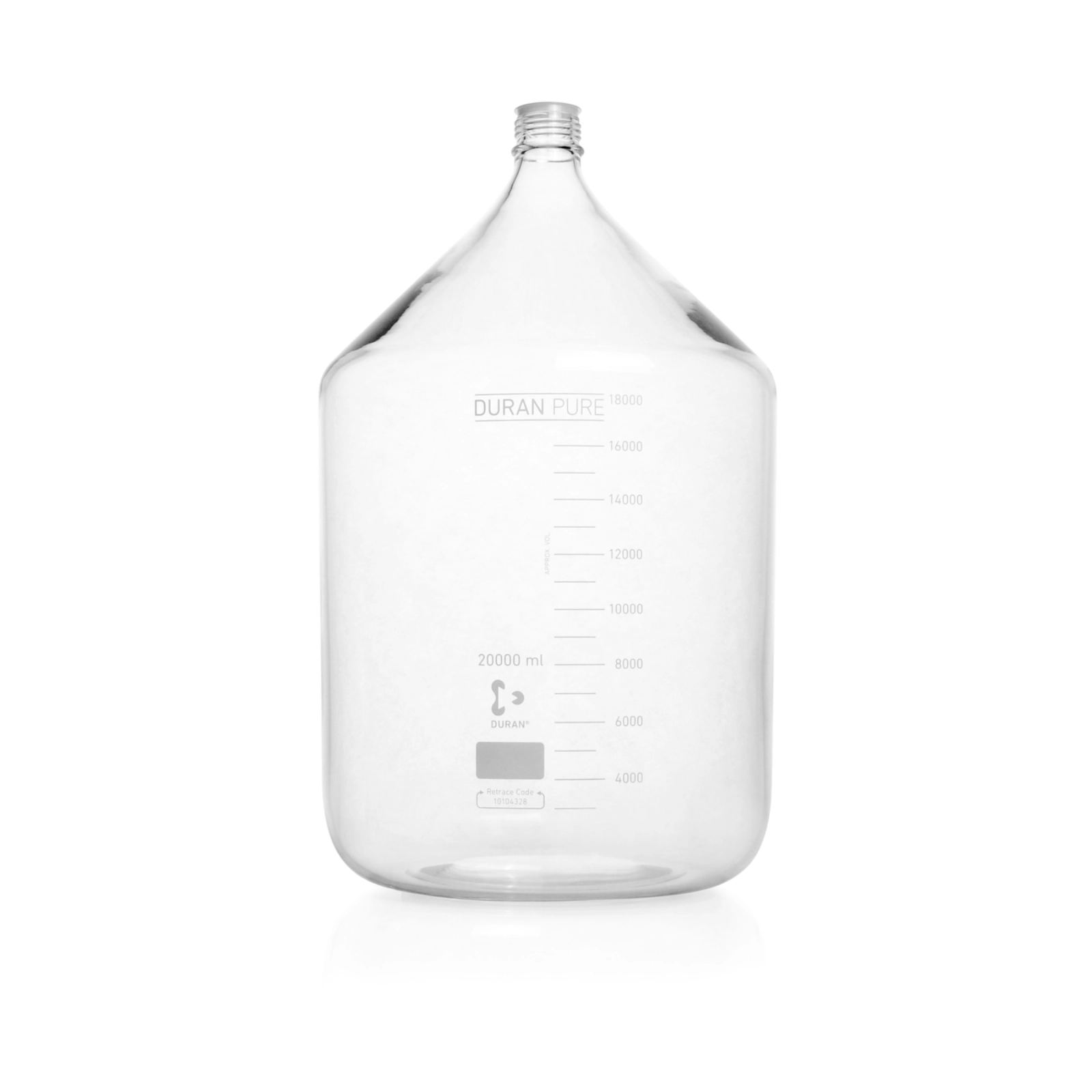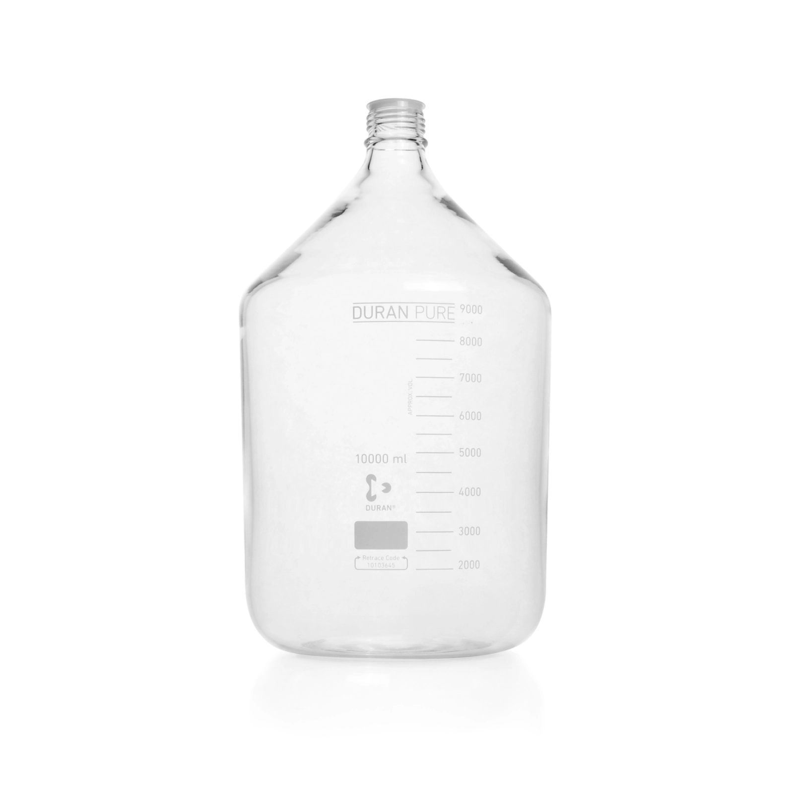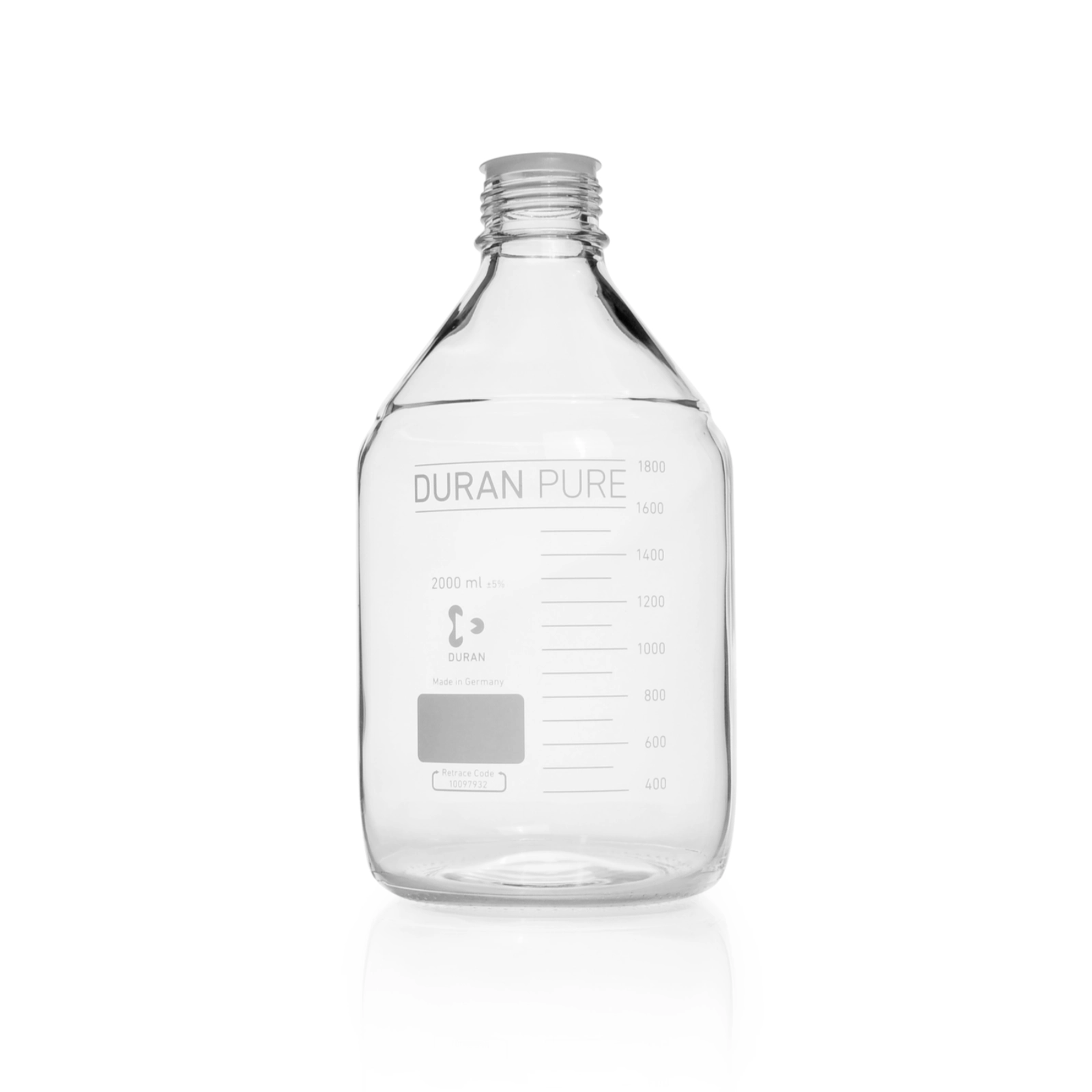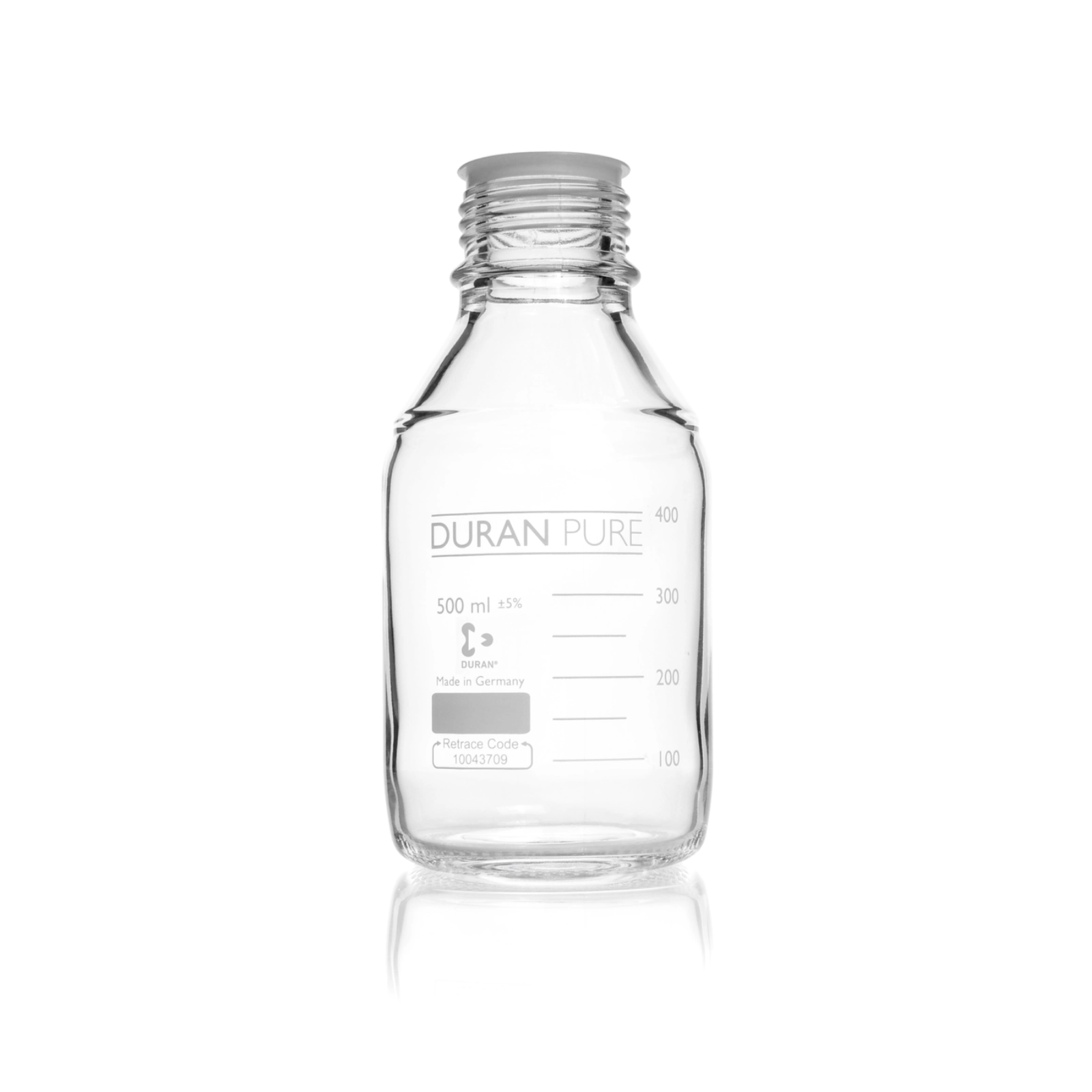 Butelki laboratoryjne Duran® Pure z bezbarwnego szkła borokrzemianowego. Ze standardowym gwintem, bez zakrętek i pierścieni wylewowych, zamykane pokrywkami ochronnymi. Opracowane na potrzeby przemysłu farmaceutycznego. Z certyfikatem analizy (CoA). Autoklawowalne.