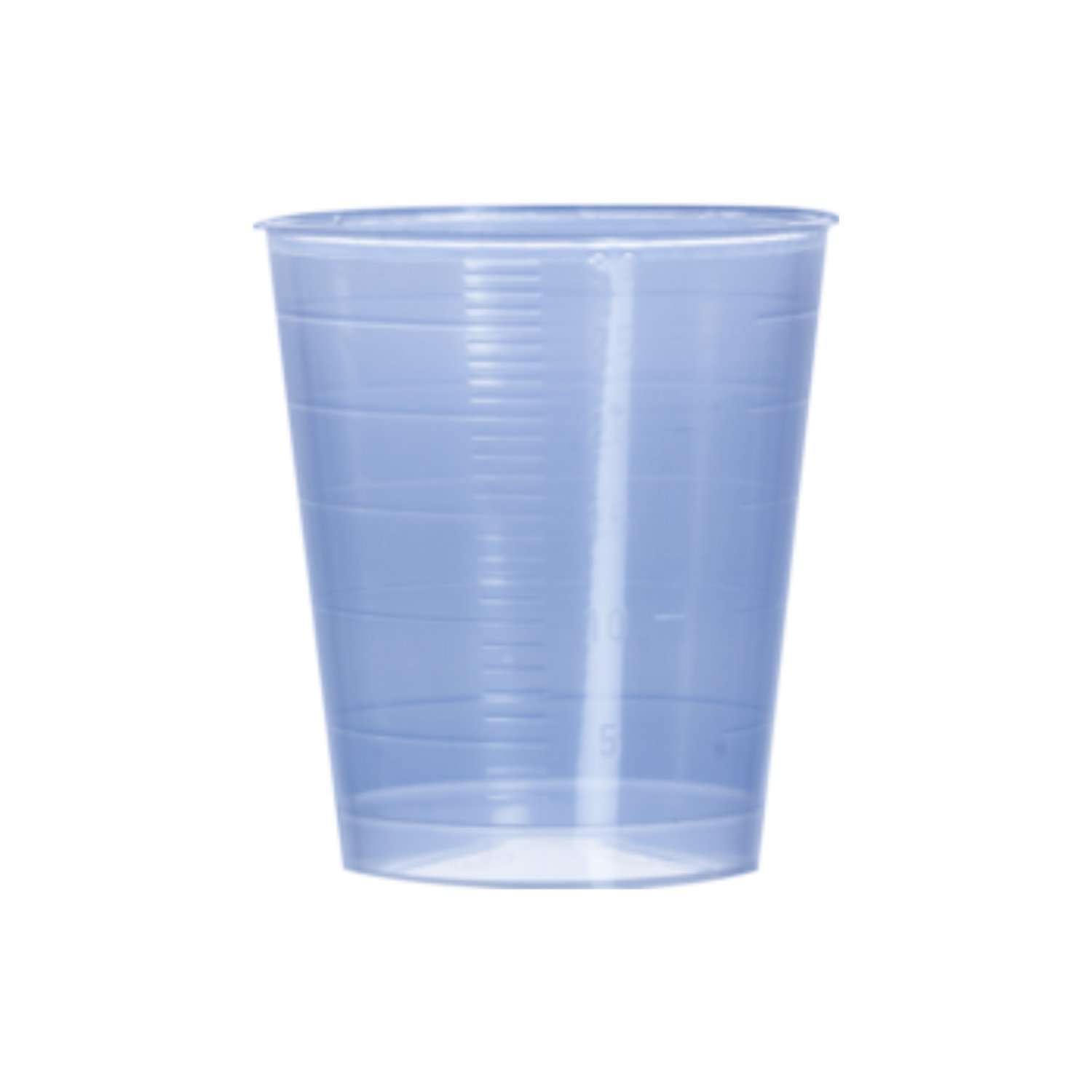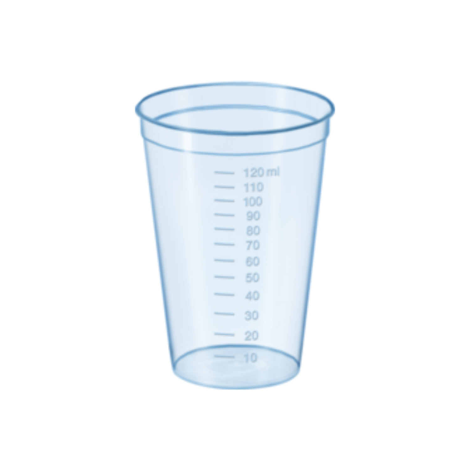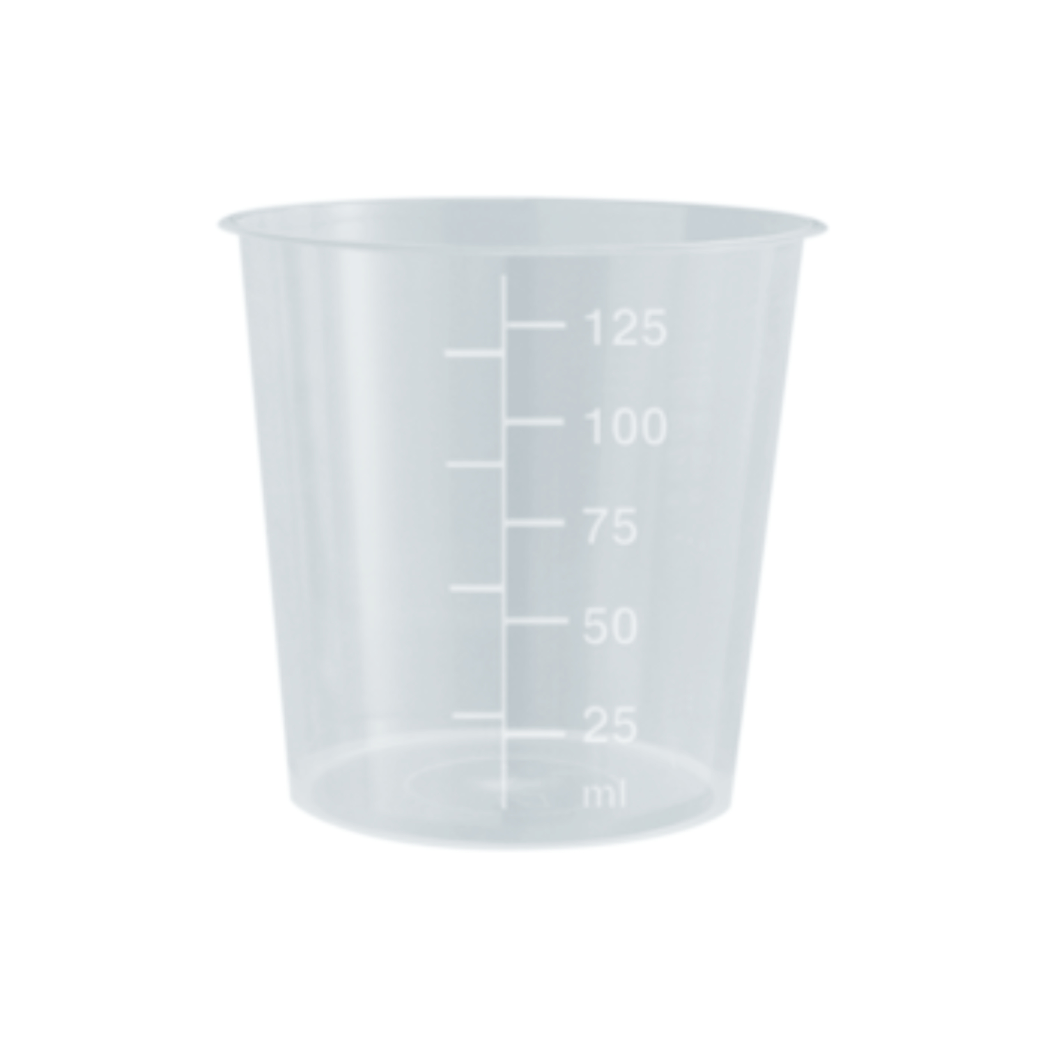 Kubki o pojemności roboczej 125 ml, wykonane z PP, bezbarwne, wysokie 85 mm, o średnicy otworu 62 mm. Skalowane co 10 ml. Opakowanie zawiera 50 szt.
