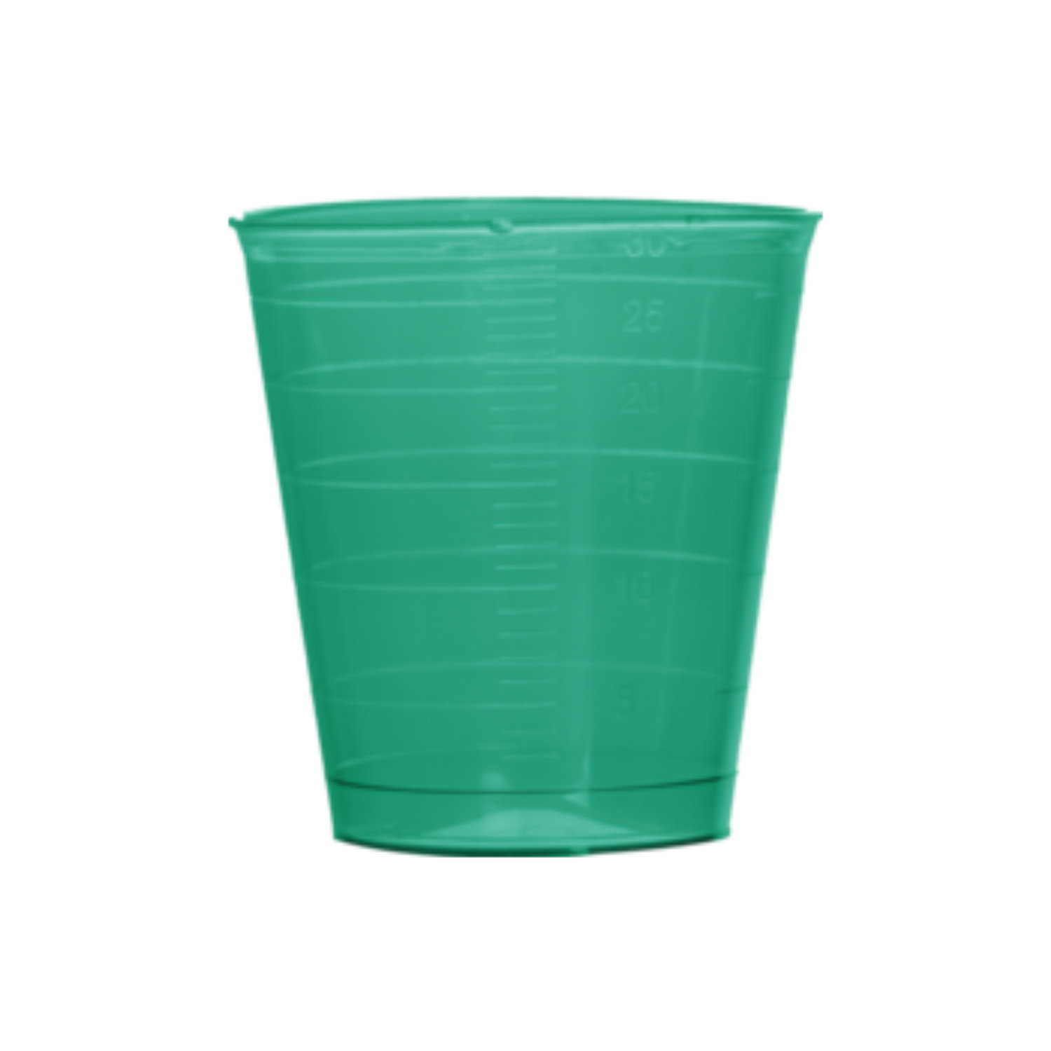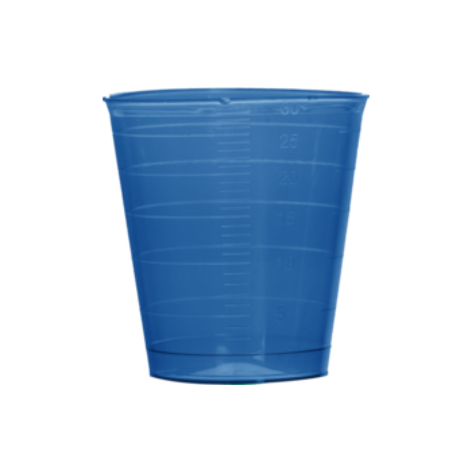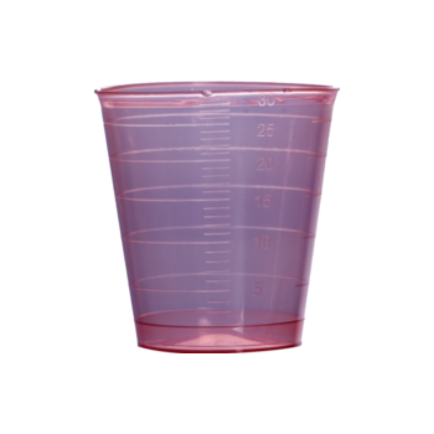 Kubki o poj. 30 ml wykonane z PP, ze skalą co 1 ml. Ich wysokość to 41 mm, a średnica górna 37 mm. Do kubków można dokupić białe pokrywki zatrzaskowe (J-0717), wyprodukowane z PE.