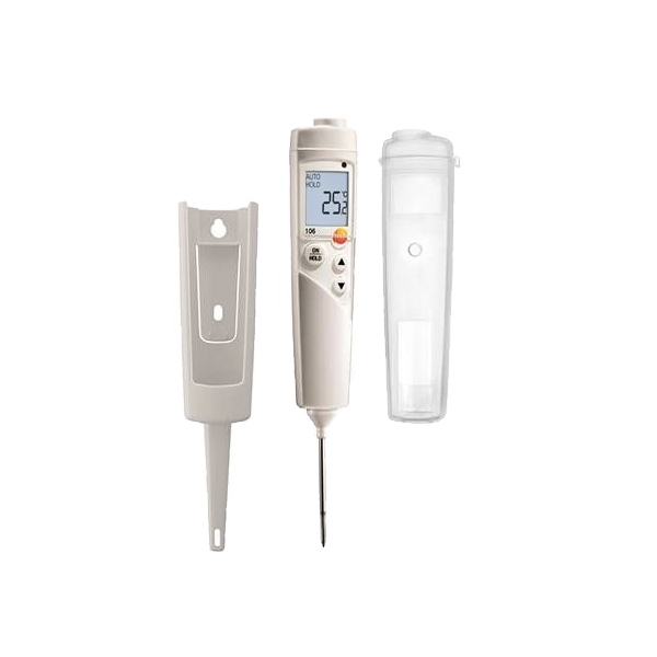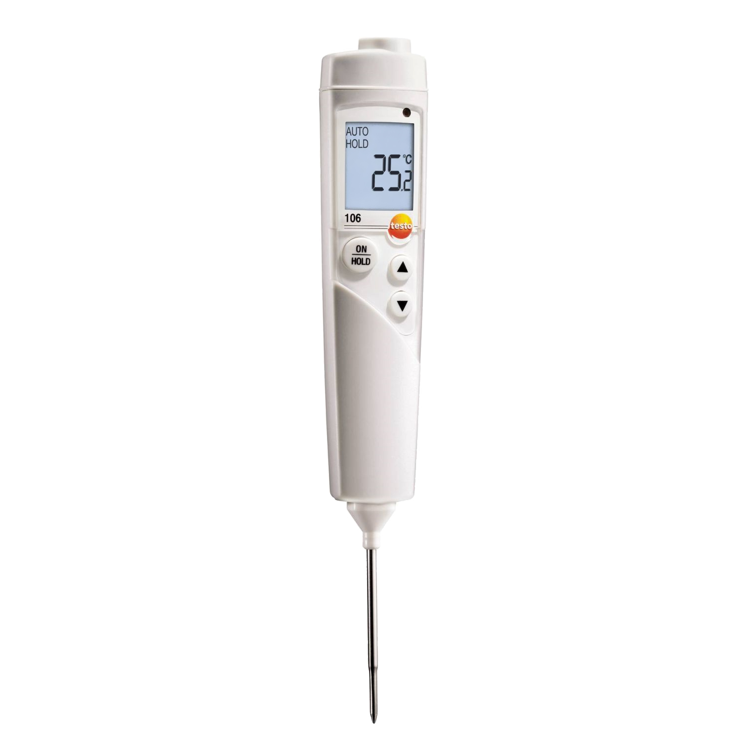 Szybki i precyzyjny termometr Testo 106 może być używany w przemyśle spożywczym. Elektroniczny i wodoodporny do pomiarów w zakresie od -50 do +275 °C.